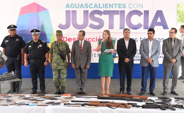 Explicó a los presentes en el acto, realizado en la Plaza de la Patria, que en colaboración con el Ejército Mexicano y de acuerdo a un convenio con una empresa fundidora, las armas, entre las que se encuentran pistolas de postas y balines, rifles, escopetas deportivas, machetes, cuchillos, manoplas, etc., serán cortadas y otras más fundidas.