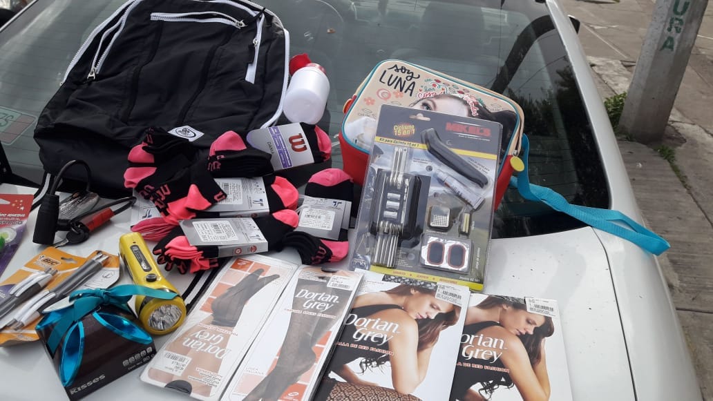 Debido a lo anterior los oficiales intervinieron logrando ubicar a los señalados a la salida de la tienda, donde fueron abordaros para una revisión preventiva; en ese momento fueron encontrados en posesión de una mochila en la que habían guardado más artículos, entre éstos un reproductor DVD, un kit para ciclista, un candado para bicicleta, una linterna, una lonchera, calcetines deportivos, y otros.