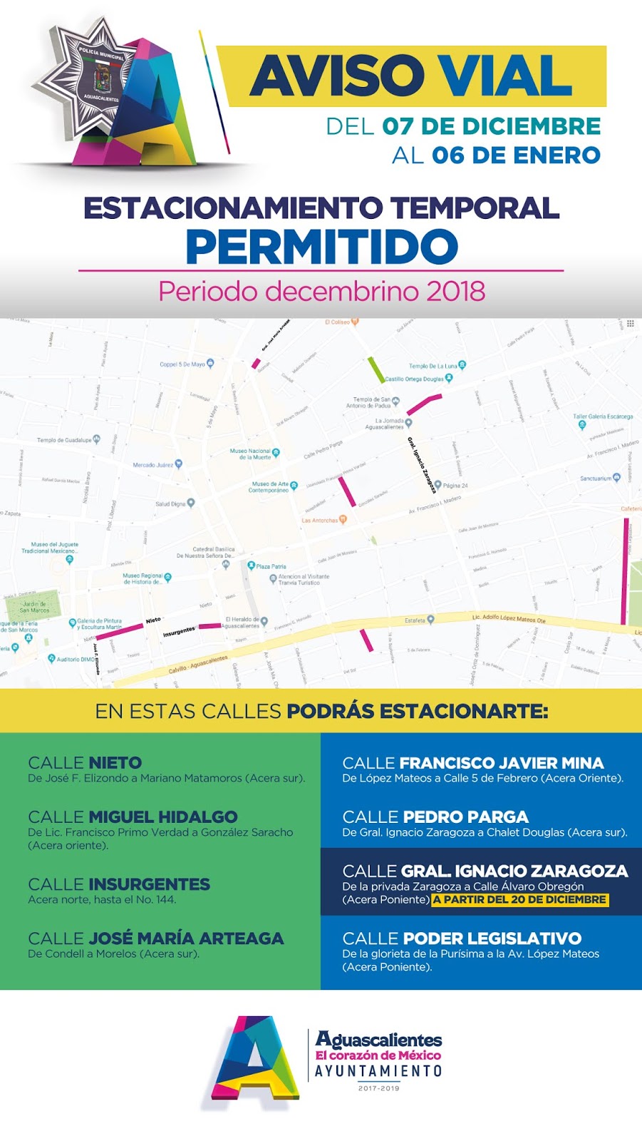 También explicó que se ha instruido a Policía Vial para que en el mismo periodo haya tolerancia en el estacionamiento en algunas vialidades, además en otros sitios de la ciudad en donde se colocan los tradicionales tianguis navideños.